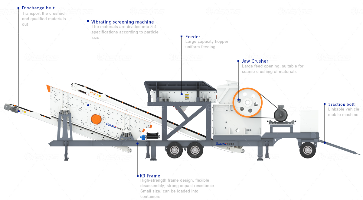 移動(dòng)生產(chǎn)線每臺(tái)設(shè)備均配備車載皮帶機(jī),運(yùn)輸無(wú)需拆卸,到達(dá)現(xiàn)場(chǎng)可快速、整潔、有序的展開工作。